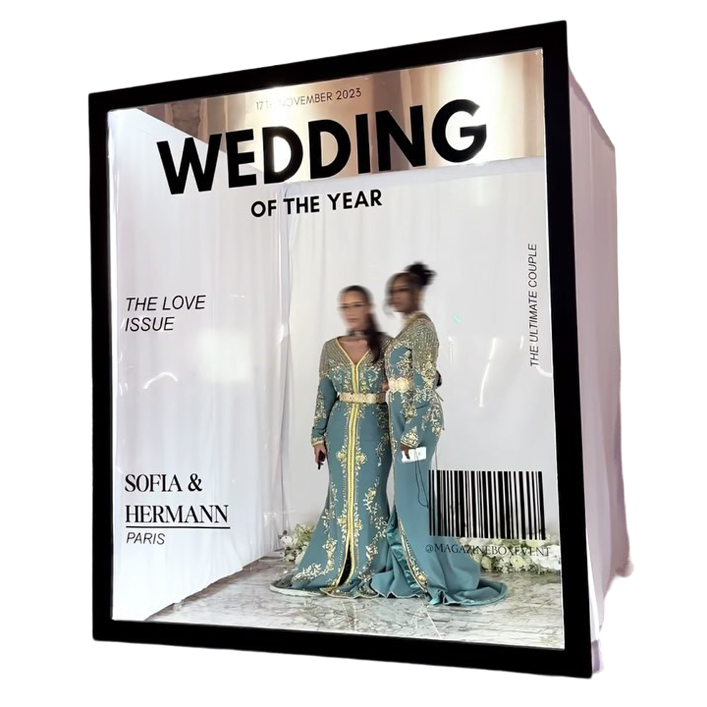 Photobooth premium avec impressions format magazine personnalisées. Vos invités repartent avec un souvenir unique — disponible mariage & événement pro.